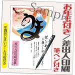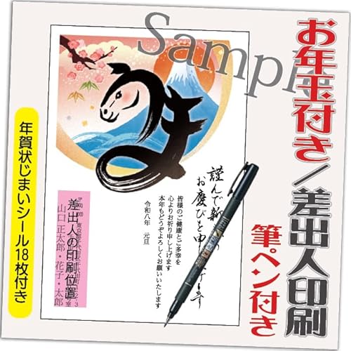 年賀状 2026 お年玉付きの12枚セットです。筆ペン付き、デザインは10枚+2枚。差出人印刷込み(デザイン:GB08)。お届け先住所と氏名を印刷します。印刷仕上げで便利にお届けします。