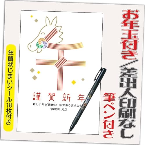 2026年用のお年玉付き年賀状(12枚セット、筆ペン付き)。午年(うま年)デザイン。印刷済みの10枚に加え、差出人なしの2枚が含まれています。年賀状じまいシールも付属。