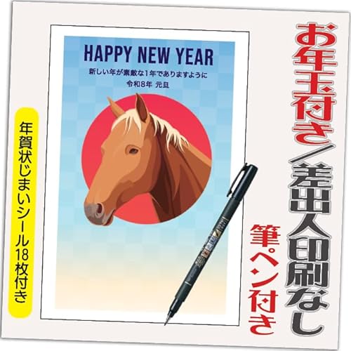 2026年の年賀状は、午年を迎える特別なデザイン「HA064」。12枚入り(印刷10枚+予備2枚)、筆ペン付き。お年玉付きで、差出人なしの仕様も魅力。年賀状じまいシール付き。