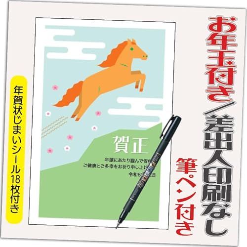 2026年の年賀状、午年(うま年)用の年賀はがきセット。お年玉付きで、12枚(印刷10枚+差出人なし2枚)と筆ペン、年賀状じまいシール付。デザインはHA087。新年のご挨拶に最適!
