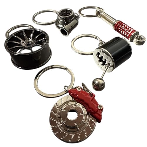 Nexxxly(ネクスリー)キーホルダーは、車好きに最適なユニークなカーパーツの5点セットです。シフトノブ、ホイール、ディスクブレーキ、サスペンション、タービンをモチーフにしたデザインで、プレゼントにもぴったりです。