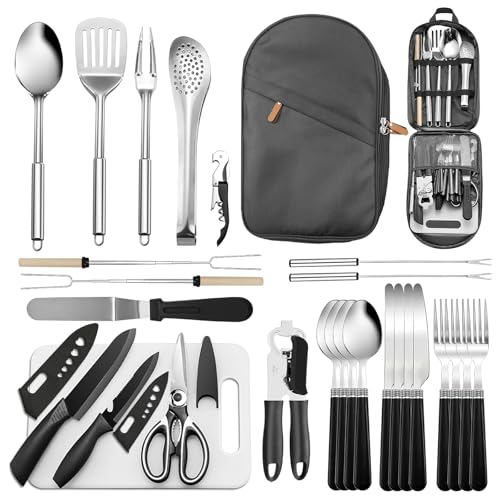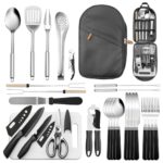 【27点セット】ステンレス製のキャンプ用品、BBQ調理器具。コンパクト収納バッグ付きで、軽量・耐久性抜群。包丁、まな板、スプーン、シザーズなど必需品が揃い、キャンプや防災時にも最適。
