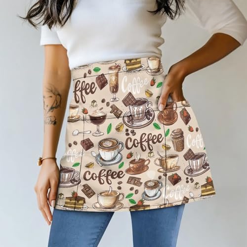このサーバーハーフエプロンはポケットが3つ付き、コーヒーデザートプリントがかわいいデザイン。水滴に強く、シェフやウェイトレスに最適。ロングウエストストラップで調整も楽々。