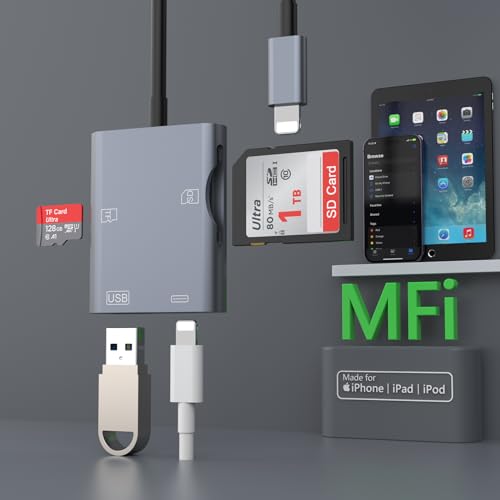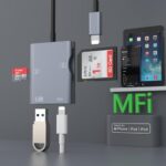 iPhone 4in1 SDカードリーダーは、SDカード、microSDカード、USBデバイス、iPhoneを接続できる便利なデバイスです。写真やデータの転送が簡単で、持ち運びに最適です。