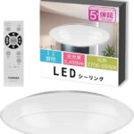 TOSHIBAのLEDシーリングライトは、調光・調色機能を備え、12畳対応で5499lmの明るさ。日本製でシンプルなデザイン。常夜灯とおやすみタイマー、リモコン付き。