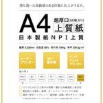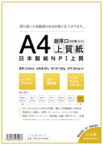 日本製紙の「超厚口」NPI上質紙は、A4サイズで50枚入り。白色度88%、紙厚0.236mm、四六判表記180kgの高品質な用紙です。印刷や書類作成に最適です。