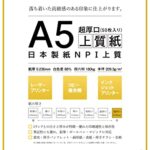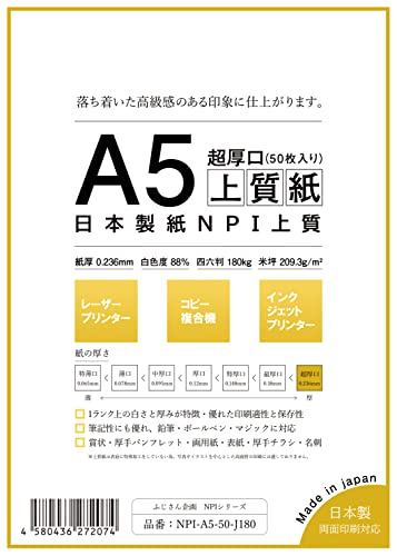 日本製紙の「超厚口」NPI上質紙 A5サイズ、50枚入り。白色度88%、紙厚0.236mmで、四六判表記180kgの高品質な用紙です。書類や印刷物に最適な選択です。