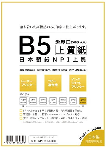日本製紙の「超厚口」NPI上質紙B5は、白色度88%、紙厚0.236mm、四六判表記180kgで、50枚入りです。高品質な仕上がりを求める方に最適な用紙です。