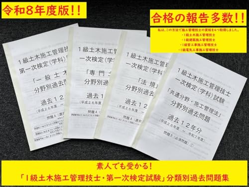PDF版・令和8年度1級土木施工管理技士/第一次定(学科)試験の過去12年分(H26R7)の分類別過去問題集です。効率的な学習に役立ち、試験対策に最適です。