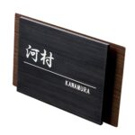 LEON(レオン)ブリエ表札は木目調でおしゃれな和モダンデザイン。サイズはW150mmxH90mm、シンプルで彫り込み切削名入れ可能。選べるフォント、屋外用で機能門柱や玄関に最適。ウォールナットベースのブラックネームプレート。