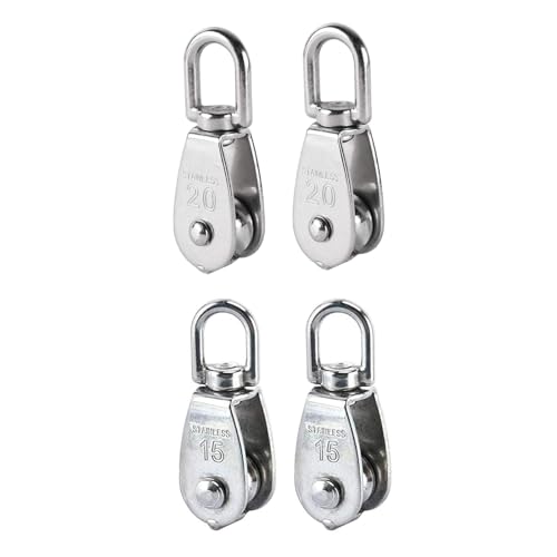 滑車4個セット。ステンレス製で耐荷重・耐久性抜群。スイベル式で360度回転可能。クレーン作業やクライミング、貨物輸送に最適。M15とM20サイズあり。