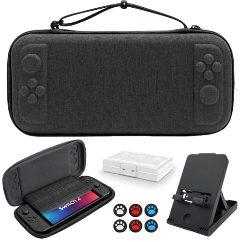 超薄型Switch2ケースは、ハードシェルで耐衝撃、防塵防水仕様。3段階調整スタンドやスティックキャップ、12ゲームカードスロット付きで、大容量の旅行用収納バッグ。全面保護が実現されています。