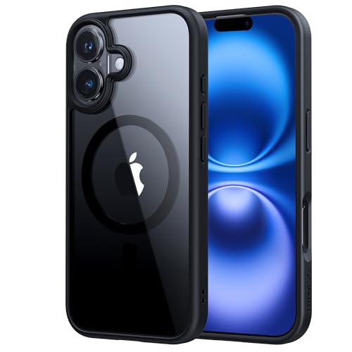 NIMASO iPhone 16用ケースは、MagSafe対応で黄変防止、耐衝撃の米軍MIL規格をクリア。薄型設計で傷つけ防止、ワイヤレス充電にも対応。ストラップホール付きの氷星シリーズ(ブラック)。