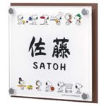 オーダー表札 丸三タカギ スヌーピーサインは、アクリルとステンレスの組み合わせで耐久性があります。サイズは幅150mm×高さ150mm、スタッド金具付きで取り付け簡単。