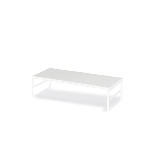 ナリタカストア製のホワイト色モニター台は、高さ185mm、幅590mmのスチール製ハイタイプ。液晶モニターやプリンター用として、オフィスや自宅でのテレワークに最適な収納と机上ラック機能を提供します。
