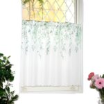 clothshopのカフェカーテンは、幅約100x丈90cmの小窓用で、絵羽リーフ柄のプリントが施されています。日中の視線遮断、UVカット機能、断熱・保温効果もあり、グリーンの色合いが魅力です。