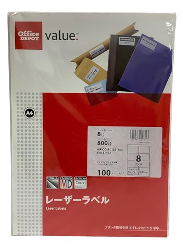 【1パック】レーザーラベル(A4)は、レーザープリンタに対応した8面角丸タイプ。1パックは100枚入りで、オフィス・デポの製品です。整理やラベリングに最適で、使いやすい設計です。
