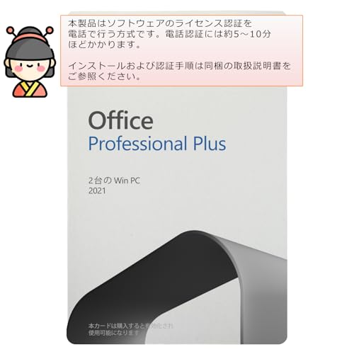 Office 2021 Professional Plusは、カード版の永続ライセンスソフトです。Win11/10に対応し、PC2台にインストール可能。電話でライセンス認証が必要ですので、手順をよくお読みください。