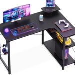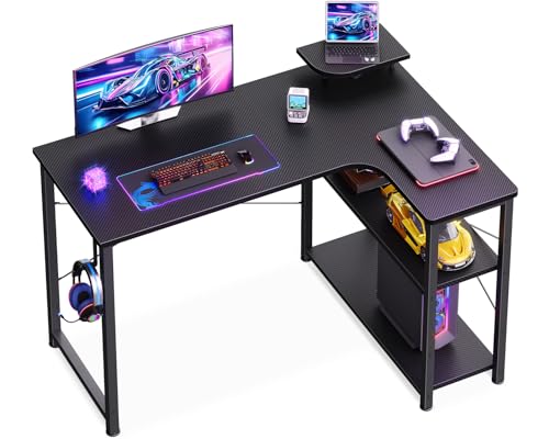 AODKのL字ゲーミングデスクは幅90cmで、右側に棚付き。簡単に組み立てられ、勉強や在宅勤務に最適。カーボンブラックのデザインが魅力的。