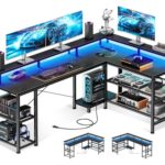 AODK ゲーミングデスクはL字型で幅150cm、コンセント付き。LEDライト、棚付きで在宅勤務や勉強に最適。組立簡単なブラックのオフィスデスクです。