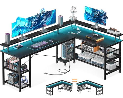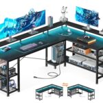 AODKゲーミングデスクは、幅168cmのL字型デザインで、コンセントとLEDライト付き。棚完備でスタイリッシュ、在宅勤務や勉強に最適な組立簡単なオフィスデスク。