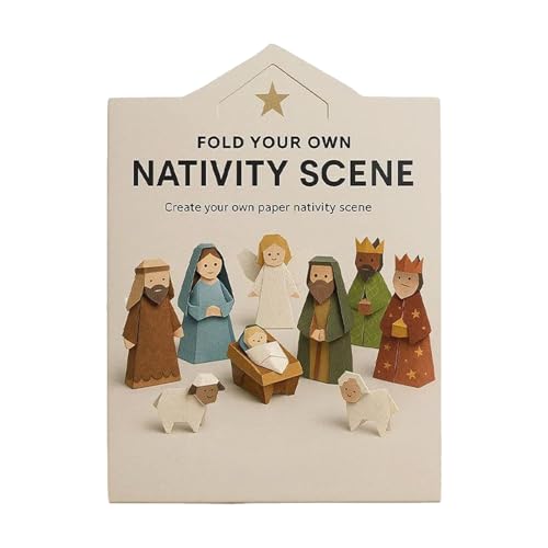 キリスト降誕シーンをDIYで作成できるペーパークラフトキット。イエス、天使、動物の切り抜きが含まれ、簡単に折りたためてクリスマスデコレーションに最適なキッズアート活動です。