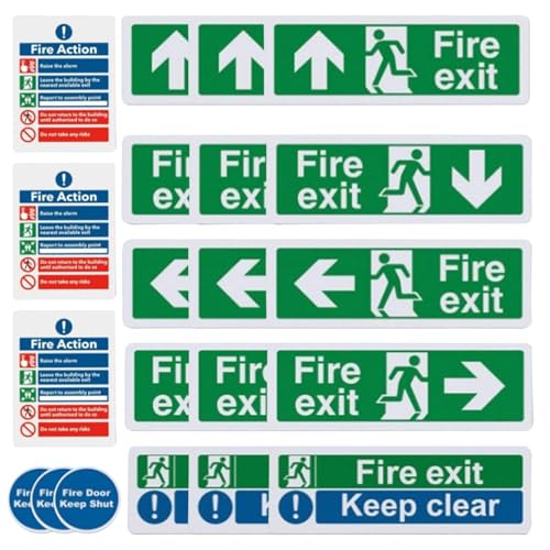 自己粘着式避難標識キット21枚セット。右に走る男性のイラストと大きなフォントで、家庭用非常口の指示を明確に示します。