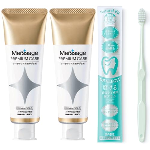 松風のメルサージュ プレミアムケアは、2本セット。ORALEGITのナチュラルフィットは、超極細0.02mmブラシで奥歯まで届き、歯周ケアに最適。国内製造で安心の品質です。