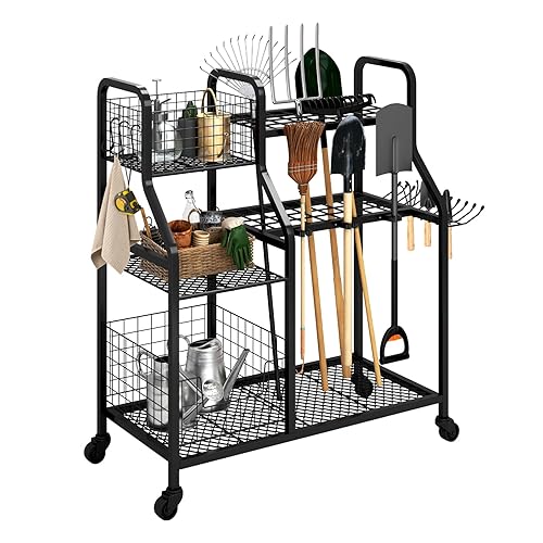 Orealindus ガーデンツール収納ラックは、スコップなどの高耐久性ガーデンツールをスマートに収納。車輪付きで移動も簡単、収納最大36個の長ハンドルツール対応。省スペース設計でガレージや倉庫に最適。