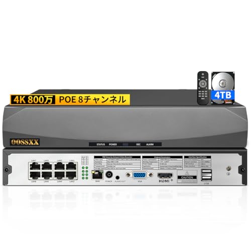 OOSSXX POE NVRは、4K・800万画素対応の8チャンネルレコーダーで、最大8台のカメラを接続可能。4TBのハードディスク内蔵で、高画質の監視映像を保存できます。