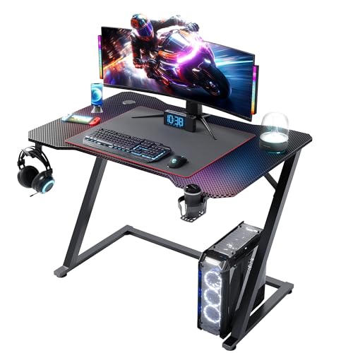 Claiks ゲーミングデスクは、炭素繊維天板を採用し、幅100cm×奥行60cm×高さ73cmで、耐荷重は80kgです。Z字フレーム、配線穴、カップホルダー、収納フック付きで、ゲーマーやオフィスワークに最適です。