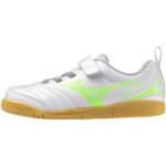ミズノのサッカーシューズ、モナルシーダ NEO 3 CLUB キッズ IN。軽量で幅広設計、部活やフットサルに最適。カラーはホワイト×ネオングリーン、サイズ20.0 cm、3E。