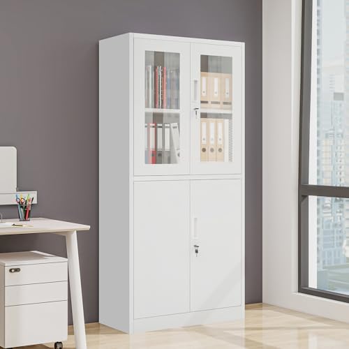 OSJ 【法人割引】【日本正規輸入品】スチール書庫 キャビネット 強化ガラス窓仕様 両開き 鍵付き オフィスキャビネット スチールロッカー 4段 書類保管庫 収納 オフィス/事務所/更衣室/学校/業務用 A4対応 棚板可動
