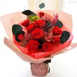 プリザーブドフラワーの花束は、すべて本物のお花を使用しており、そのまま飾れる美しいブーケです。色はレッドで、バラやカーネーションが含まれ、誕生日や卒業、結婚、退職祝いに最適です。