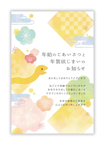 年賀状じまいハガキ10枚セット。新年のご挨拶をお知らせするための私製はがき。フチなしの全面プロ仕上げで、印刷品質が高い。パピレイJIM-242-ETはおしゃれで使いやすいデザインが特徴。