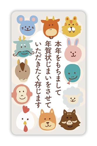 年賀状じまいシール 24枚(日本製)。スリムな縦長サイズで宛名を邪魔せず、洗練された優しいデザインが魅力。サイズは5x3cm、最後の挨拶状に最適です。