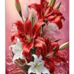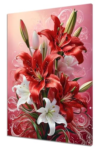 赤数字油絵キット。DIYで簡単に塗れるユリのデザイン。初心者や子供向けのアクリル水彩絵の具を使用。フレームレスで、サイズは40x50cm(16x20in)。家の壁装飾に最適です。