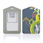 グレーのパスケースで、定期入れやICカード・IDカード入れとして使用可。ネックストラップ付きで、通学や通勤に便利。クールな矢印ペイントデザイン。