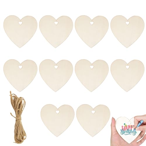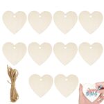 PAVIKE 木製チップ ハート型 10枚入り 8cm 穴付き 麻糸付き 空白 書き込み可能 DIY用品 吊り飾り 装飾材料 記念品 手芸 素材 ウッドチップ アクセサリーパーツ パーティー、文化祭、結婚式、誕生日、クリスマス、祭り、卒業式用