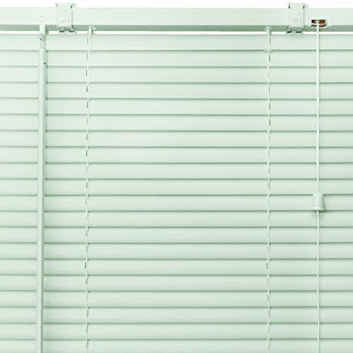 イージーブラインド プラスチック ブラインドは幅90cm×高さ130cm、ライトグリーンが特徴。幅81~100cm×高さ102~150cmのサイズから選べ、カーテンレールにも取り付け可能です。