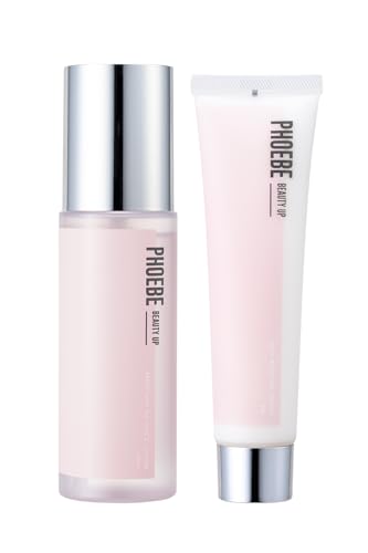 PHOEBE BEAUTY UP スキンケアセットは、化粧水120mLと乳液60gが含まれ、敏感肌向け。ビタミンC誘導体、CICA成分、ヒト幹細胞培養液配合で、肌をしっかり保湿し、健康的な美肌へ導きます。
