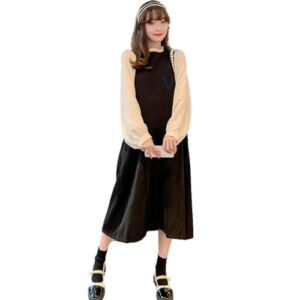 [エバーオリーブ] 【在庫限り】レイヤード風 ロング ワンピース 異素材 ドッキング 長袖 フレア 体型カバー らくちん マタニティ リボン クルミボタン バックリボン ブラック 黒 EO11-BK-XL