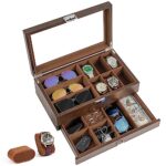ProCase 木製メンズジュエリーボックスは、2段式のウォッチホルダーとサングラスボックスを備え、透明ガラス天板と収納引き出し付きのディスプレイケースです。