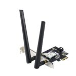 ASUS AX1800 PCIe WiFiアダプターは、WiFi 6対応で最大1800Mbpsのデータレート、Bluetooth 5.2、超低遅延を実現。OFDMA、MU-MIMO、WPA3セキュリティを備え、外部アンテナ2個が付属しています。