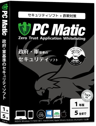 PC Matic AntiVirusは、政府・軍基準のセキュリティを提供し、詐欺対策も強化。Windows 11/10、macOS、Android、iOSに対応。1年5台使用可。
