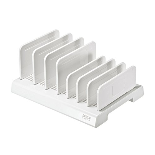 サンワサプライのタブレット・スマートフォンスタンド(7台収納タイプ)は、仕切り板の幅を変更可能で、ホワイトカラーです。安定した収納力で、機器を整理整頓できます。
