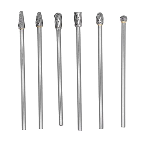 6 個の 6 インチロング超硬ロータリーバーセット。直径 6mm (0.2 インチ) のラウンドシャンクを持ち、タングステン鋼製。木工の穴あけや彫刻に最適なダイグラインダーバーセットです。