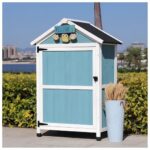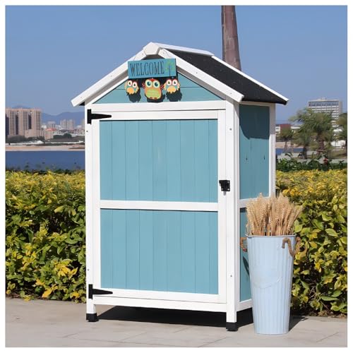 木製ガーデンロッカーは、屋外物置として最適で、屋根付きでユーティリティ整理器としても使えます。青い芝生に美しく調和し、アウトドアテラスでのツール収納に便利です。