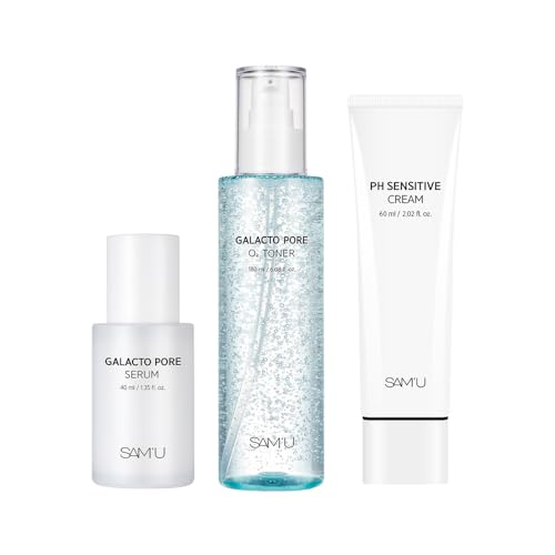 サミュ ガラクトPHスキンケアセットは、ガラクトポアオーツートナー(180ml)、ガラクトポアセラム(40ml)、PHセンシティブクリーム(60ml)から構成。肌の水分バランスを整え、敏感肌を優しくケアします。