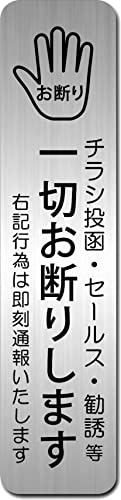 チラシ投函、勧誘、セールス一切お断りのサインプレートです。ヘアラインシルバーのメタル調アクリルを使用し、長四角のデザイン。UV対策品で、日本製の高品質な製品です。